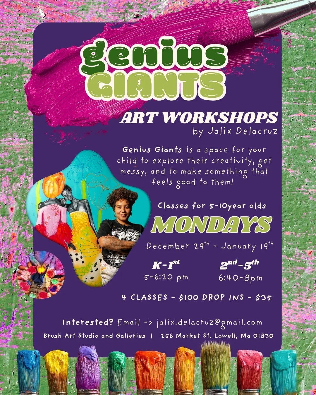 This program will run on Mondays beginning December 29th, 2025 until January 19th, for a total of 4 weeks at The Brush Studios and Gallery at 256 Market Street Lowell, MA.
